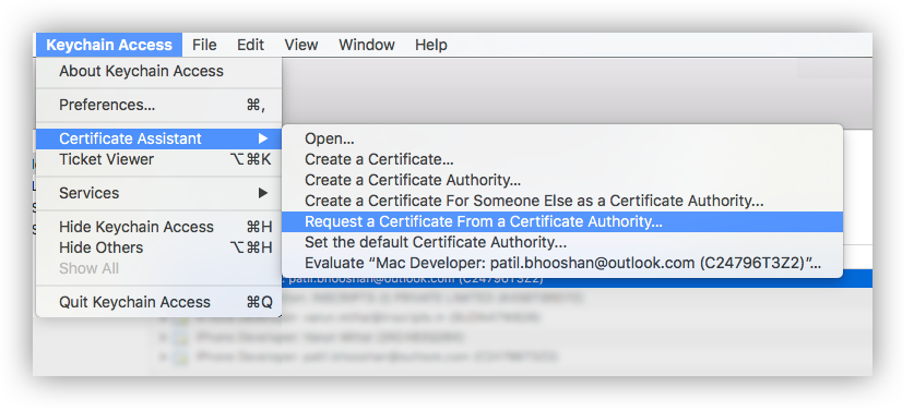 - Open Keychain Access → Certificate Assistant → Request a Certificate From a Certificate Authority.
