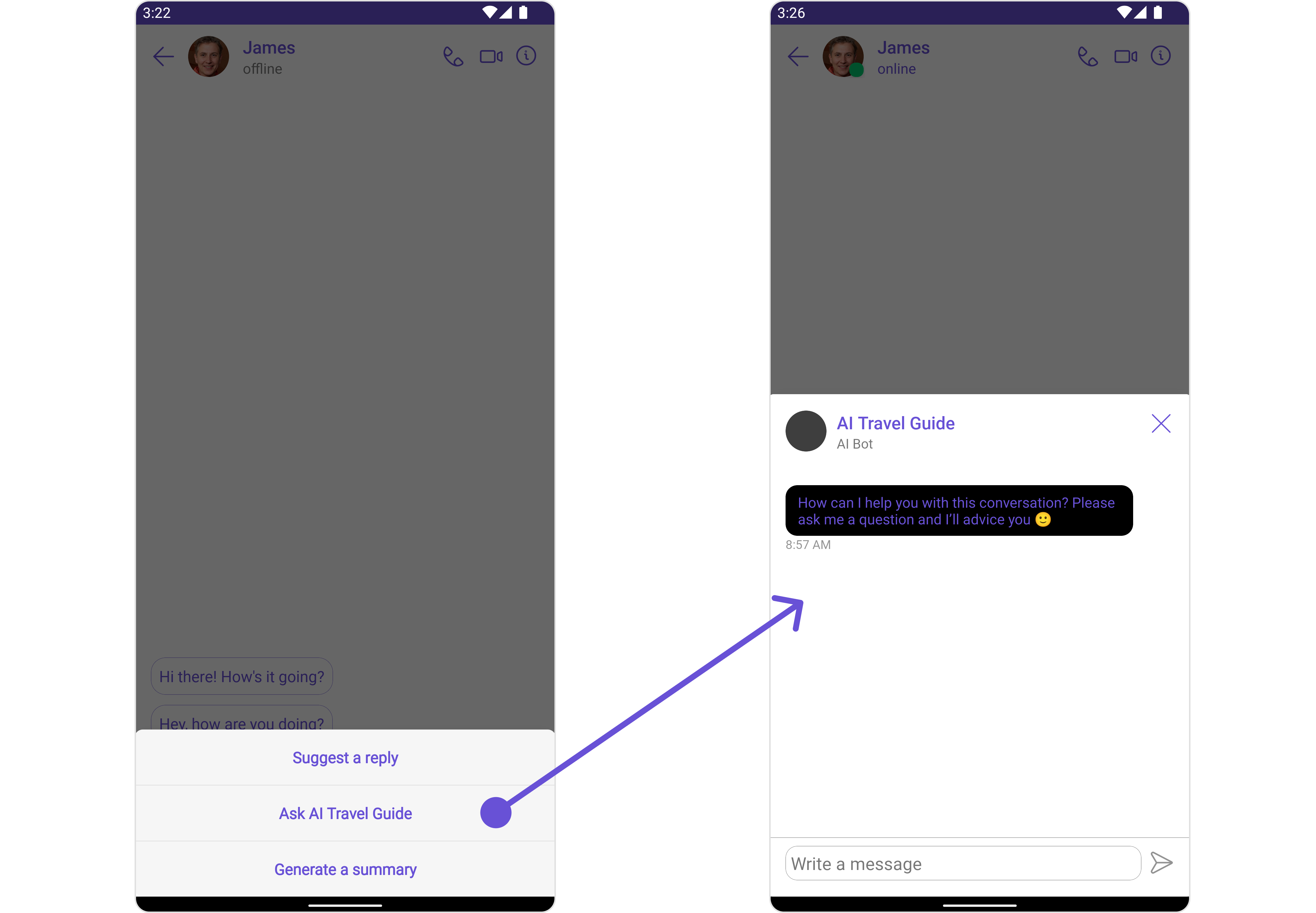 Smart Replies are AI-generated responses to messages. They can predict what a user might want to say next by analyzing the context of the conversation. This allows for quicker and more convenient responses, especially on mobile devices. For a comprehensive understanding and guide on implementing and using the Smart Replies, refer to our specific guide on the Smart Replies. Once you have successfully activated the Smart Replies from your CometChat Dashboard, the feature will automatically be incorporated into the Action sheet of MessageComposer Component of UI Kits.